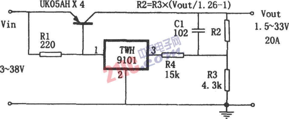如圖所示為低壓差高精度大電流穩(wěn)壓電源電路。它是采用精密穩(wěn)壓推動集成電路TWH9101和大功率調整管UK05AH組成的,具有以下特點:(1)可根據(jù)實際需要加裝調整管。每只UK05AH能通過5A電流。圖中采用4只并聯(lián)。輸出電流可達20A。(2)壓差小,在滿載時,輸入與輸出之間壓差僅為1.5V。 (3)電壓調整率達0.004%。(4)推動集成電路TWH9101具有過熱保護功能,將它直接貼在調整管殼式散熱器上安裝,監(jiān)測電源溫度,因此電源工作安全可靠。
