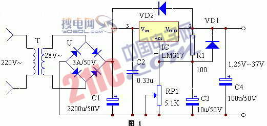 這是一種輸出電壓連續(xù)可調(diào)的集成穩(wěn)壓電源,輸出電壓在1.25-37V之間連續(xù)可調(diào),輸出最大電流可達(dá)1.5A。電路簡單,很適宜電子愛好者自制,可用于各種小電器供電。