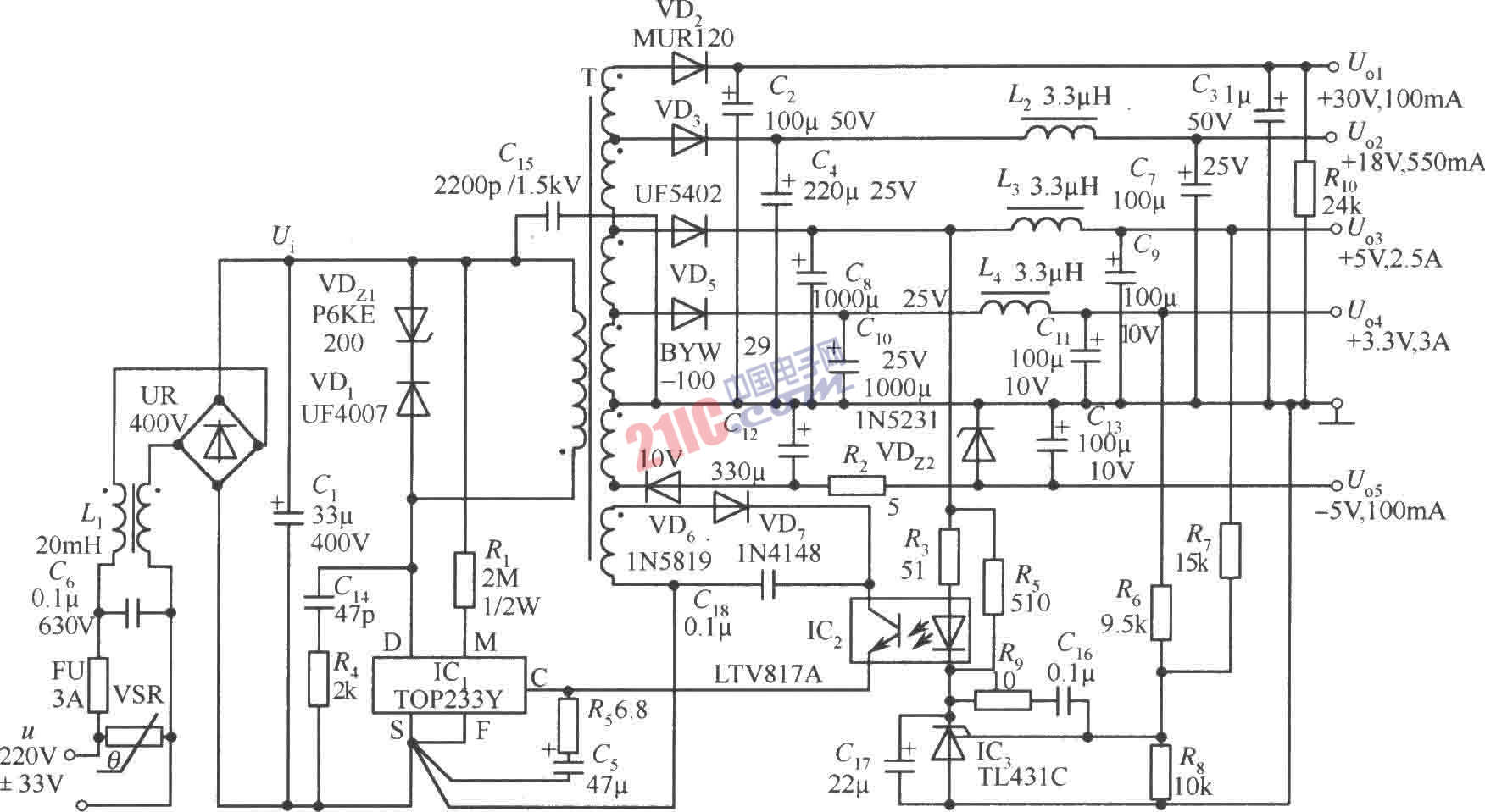 具有5路輸出的35W機頂盒開關(guān)電源電路如圖所示。這5路電壓分別為:Uo1(+30V、100mA),Uo2(+18V、550mA),Uo3(+5V、2.5A),Uo4(+3.3V、3A),Uo5(-5V、100mA)。其中,+5V和+3.3V作為主輸出,其余各路均為輔輸出。當(dāng)交流輸入電壓u=220(1±15%)V時,該開關(guān)電源總輸出功率達38.5W,若采用寬范圍電壓輸入(u=85~265V),總輸出功率就降低25W??捎米鳈C頂盒(Set?top Box)、錄像機(VCR)、攝錄像機(CVCR)和DVD機中的開關(guān)電源。該機頂盒開關(guān)電源的效率高于77%,具有欠電壓和過電壓保護功能。