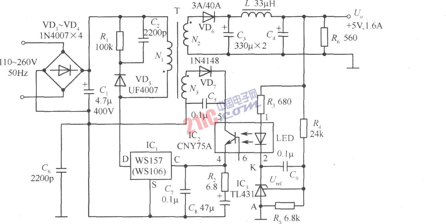 如圖所示,該電路中增加了光耦合器(CNY75A)和可調(diào)式精密并聯(lián)穩(wěn)壓器(TL431)。R3為限流電阻,R4和R5為取樣電阻。當(dāng)Uo變化時(shí),取樣電壓就與TL431內(nèi)部的2.5V基準(zhǔn)電壓進(jìn)行比較,使K端電位發(fā)生變化,改變CNY75A中發(fā)射管(LED)的工作電流及發(fā)光強(qiáng)度,再經(jīng)過光耦去調(diào)節(jié)WSl57的控制端電流,即可對(duì)占空比進(jìn)行精細(xì)調(diào)節(jié),實(shí)現(xiàn)精密穩(wěn)壓的目的。CNY75A還起到電氣隔離作用。實(shí)測(cè)該開關(guān)電源的Sv<0.1%,SI=0.78%。