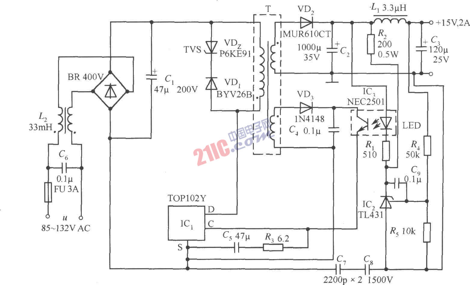 由TOP102Y構(gòu)成的+15V、2A開關(guān)直流穩(wěn)壓電源電路如圖所示。其特點(diǎn)是利用2.5V可調(diào)式精密并聯(lián)穩(wěn)壓器TL431來代替穩(wěn)壓管,對(duì)輸出電壓進(jìn)行自動(dòng)精細(xì)調(diào)節(jié)。欲獲得其他標(biāo)稱輸出電壓,可通過改變R4、R5的分壓比來實(shí)現(xiàn)。TL431的穩(wěn)壓值就由R4、R5設(shè)定。C9可改善TL431的增益線性度,使之工作更加穩(wěn)定。Rl除作LED的限流電阻之外,還決定高頻回路的增益。C6、C8為安全電容,能夠?yàn)V除因初、次級(jí)耦合電容而產(chǎn)生的共模干擾。