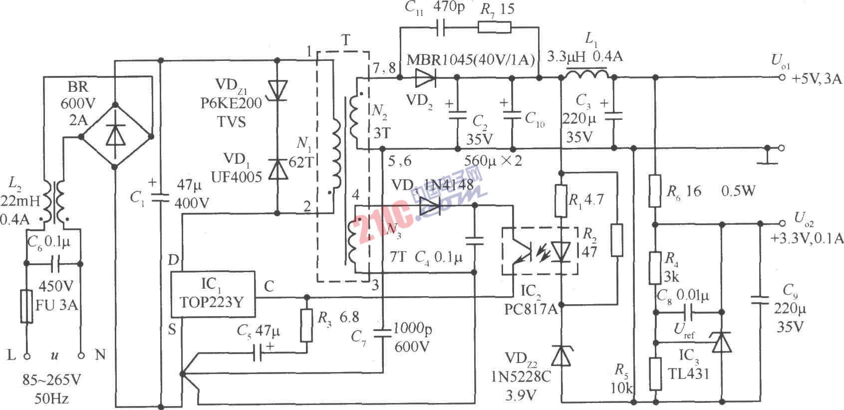 由TOP223Y構(gòu)成的主輸出為+5V(3A)、輔輸出為+3.3V(0.1A)的15W開(kāi)關(guān)穩(wěn)壓電源電路如圖所示。該電源采用一片TO-220封裝的TOP223Y型單片開(kāi)關(guān)電源,最大輸出功率達(dá)30W,可作為打印機(jī)、監(jiān)視器的開(kāi)關(guān)電源。若將+3.3V設(shè)計(jì)成主電源,則可作為筆記本電腦的開(kāi)關(guān)電源。該電源的交流輸入電壓范圍為85~265V,電壓調(diào)整率為±0.7%,負(fù)載調(diào)整率為+1.1%,電源效率η>70%。