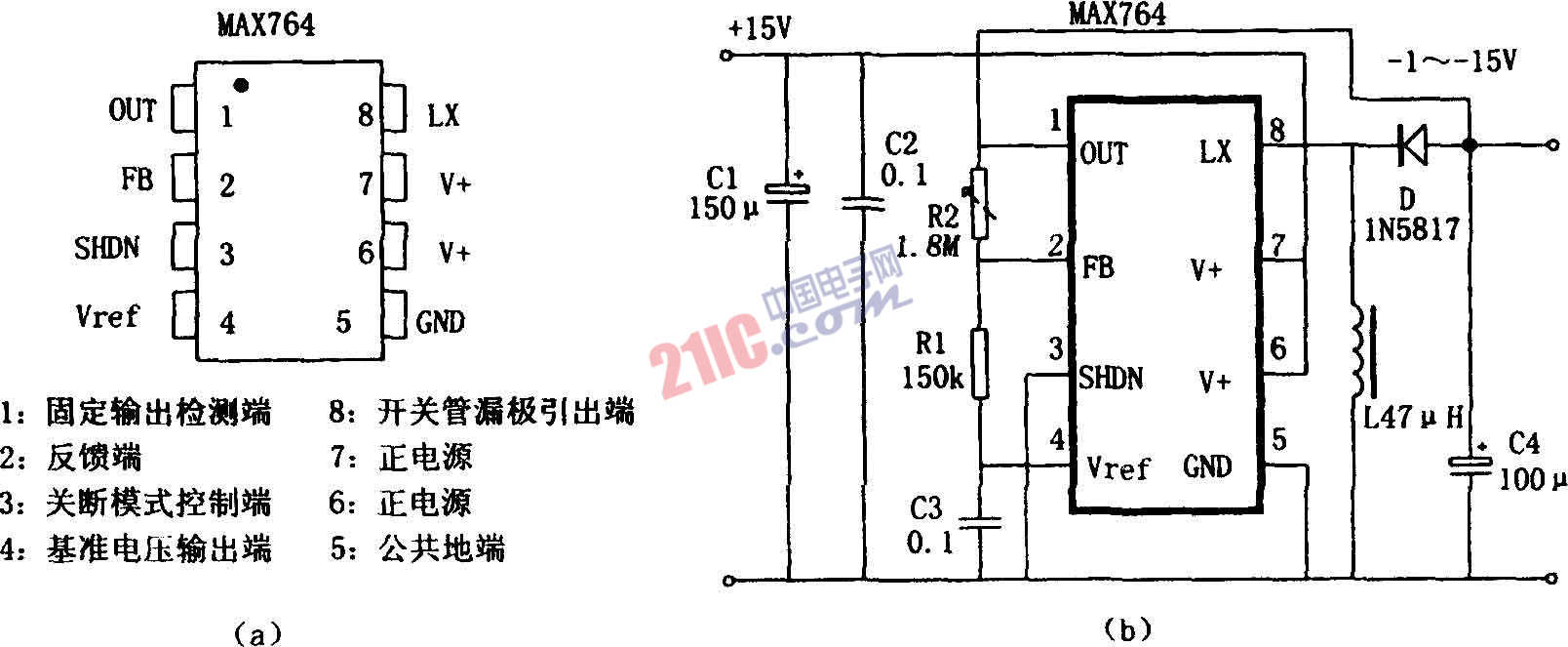 如圖所示為采用MAX764構(gòu)成的可調(diào)式極性反轉(zhuǎn)電源。MAX764是一種高效率、低功耗、輸出可調(diào)式直流電源變換器,它采用電流控制型脈頻調(diào)制器(PFM),并兼有脈寬調(diào)制器(PWM)的優(yōu)點(diǎn)。利用外部?jī)?chǔ)能電感、濾波電容和續(xù)流二極管構(gòu)成極性反轉(zhuǎn)電路,產(chǎn)生負(fù)壓輸出。輸入電壓在3~16V之間,輸出電壓可固定為-5V.還可設(shè)置成-15V可調(diào)。最大輸出電流為250mA,效率達(dá)80%以上,靜態(tài)電流為120μA,關(guān)斷狀態(tài)為5μA。MAX764的封裝為DIP8,外形及管腳見圖(a),具體DC/DC變換電路見圖(b)。輸出電壓V0=-VREF×(R2/R4)。VREF為片內(nèi)基準(zhǔn)電壓,VREF=1.5V。