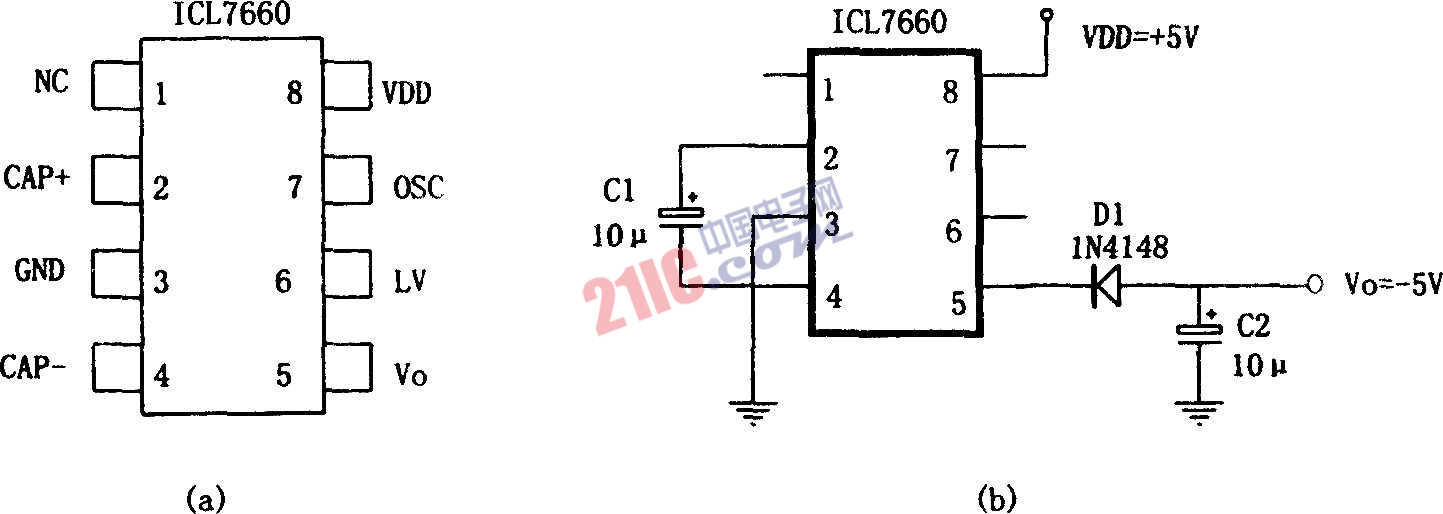 如圖所示為由ICL7660和外部的兩只電容組成的極性變換電源。該電源采用專用極性變換集成電路ICL7660和外部的兩只電容構(gòu)成的電荷泵進(jìn)行DC/DC電壓極性轉(zhuǎn)換。其轉(zhuǎn)換效率高,為95%,電能消耗小。靜態(tài)電流為0.5mA,輸出電流為10~20mA。