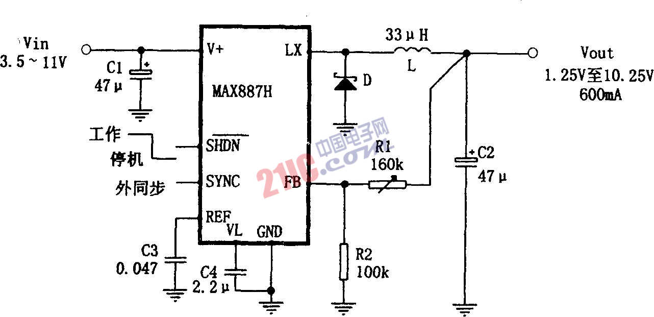 如圖所示為以高效率、低噪聲PWM轉(zhuǎn)換器MAX887(8-SO封裝)為核心,外接少量元件組成的可調(diào)式降壓電源。其特點(diǎn)是:(1)輸入電壓在3.5V至11.5V范圍,輸出電壓1.25V至10.25V;(2)輸出電流600mA,而靜態(tài)電流200μA.停機(jī)模式時(shí)僅2.5μA;(3)轉(zhuǎn)換效率高達(dá)95%;(4)MAX887的300kHz固定工作頻率,有效降低了外圍元件的體積和成本。整個(gè)電源可做的很小,適用于微型設(shè)備。