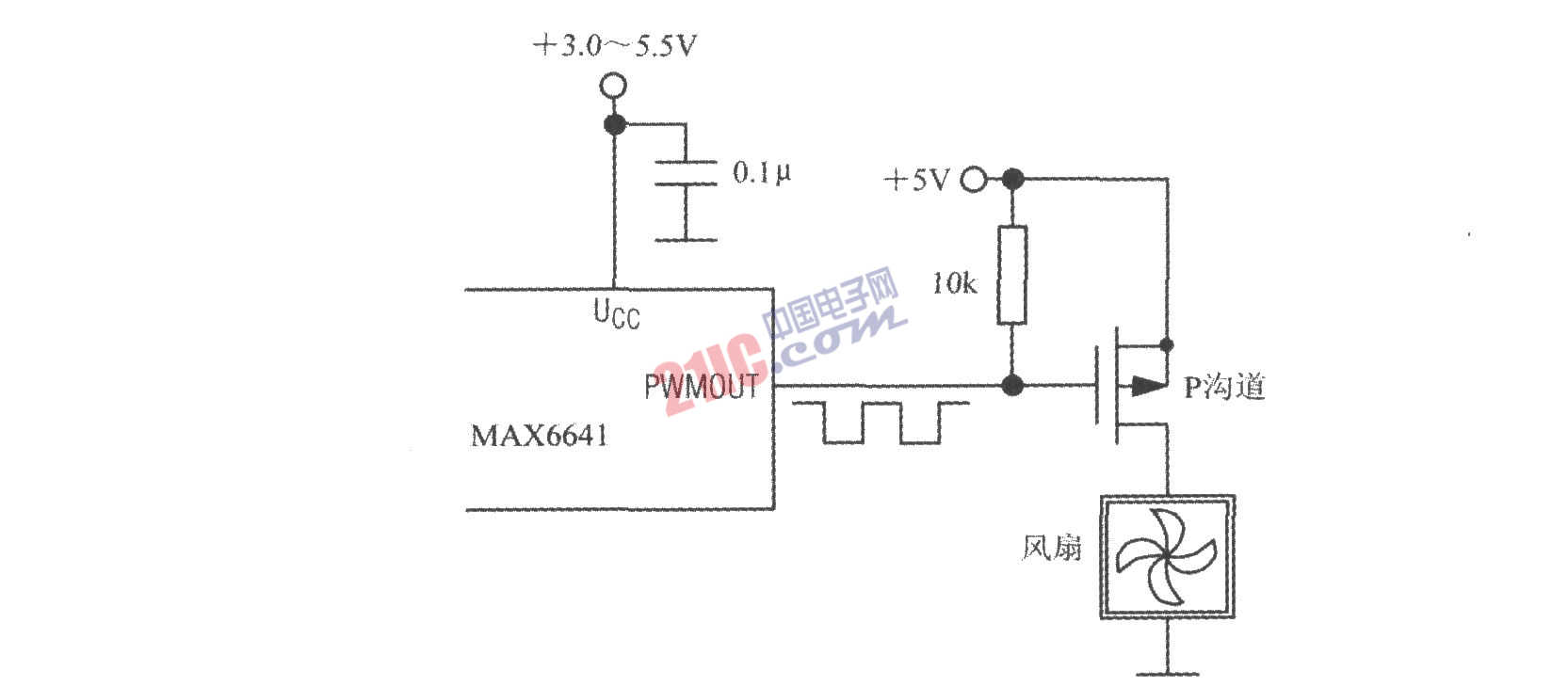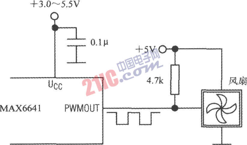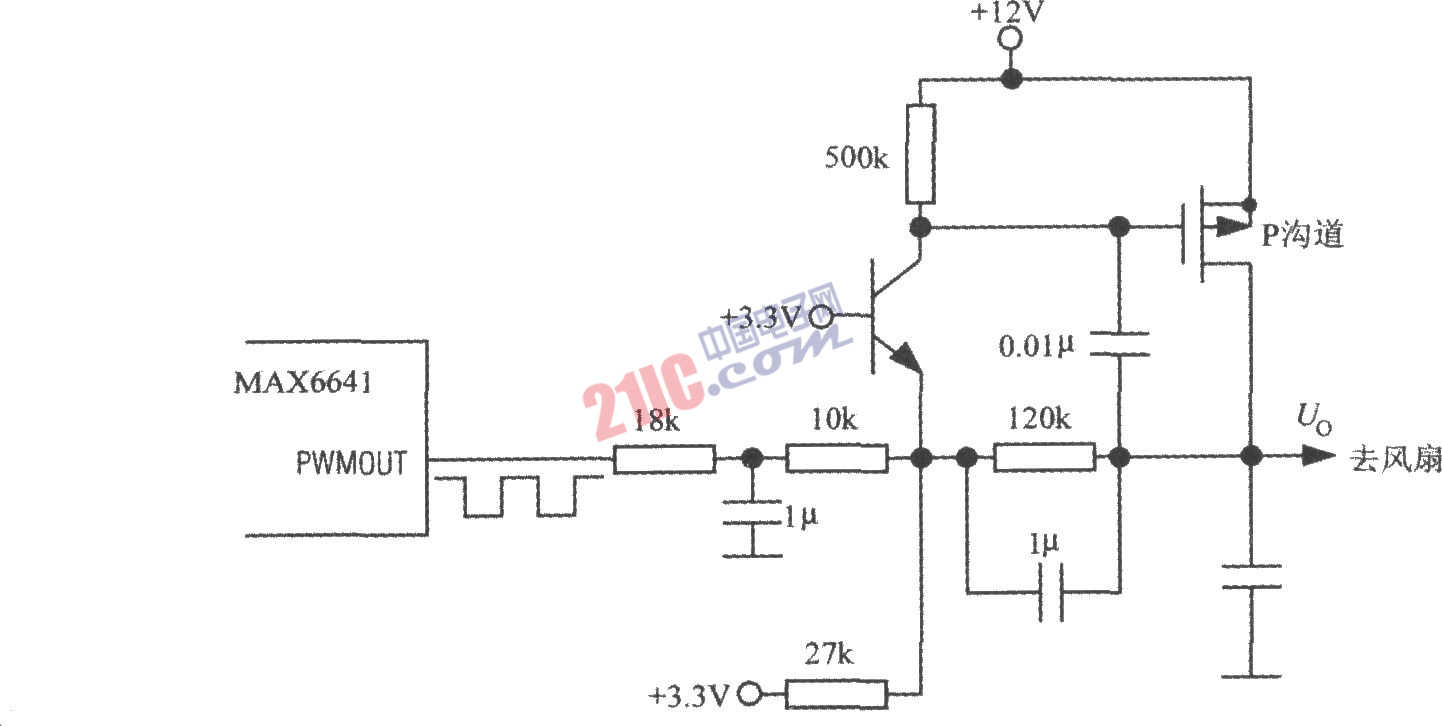 將PWMOUT信號(hào)轉(zhuǎn)換成與占空比成正比的直流電壓,作為風(fēng)扇的電源。這種方法的電源效率較低,但能降低風(fēng)扇噪聲。