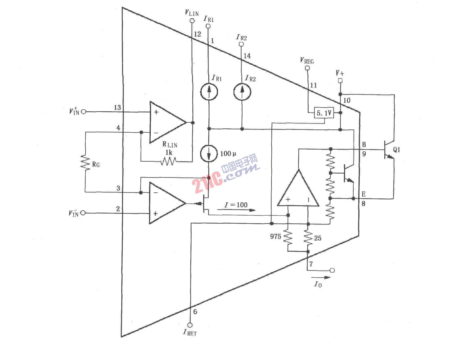 XTR112/114是單片4~20mA兩線電流變送器,為高阻鉑RTD傳感器和電橋提供完整的電流激勵,其片內(nèi)集成了儀器放大器和電流輸出電路。XTR112有兩路250μA電流源,XTR114有兩路100μA電流源,可用于激勵RTD。通用線性化電路對RTD提供兩級修正,實現(xiàn)典型的40:1線性化改進(jìn)。儀器放大器可為一個寬范圍的溫度或壓力測量設(shè)置增益。完整的電流發(fā)送器的總未調(diào)整誤差很低,可用于許多無需調(diào)整的應(yīng)用場合。XTR112/114有零輸出電流漂移、步長漂移和非線性等特點(diǎn),工作時的環(huán)路電源電壓可低至7.5V,工作溫度范圍為工業(yè)級-40~+85℃。其引腳排列如圖所示。