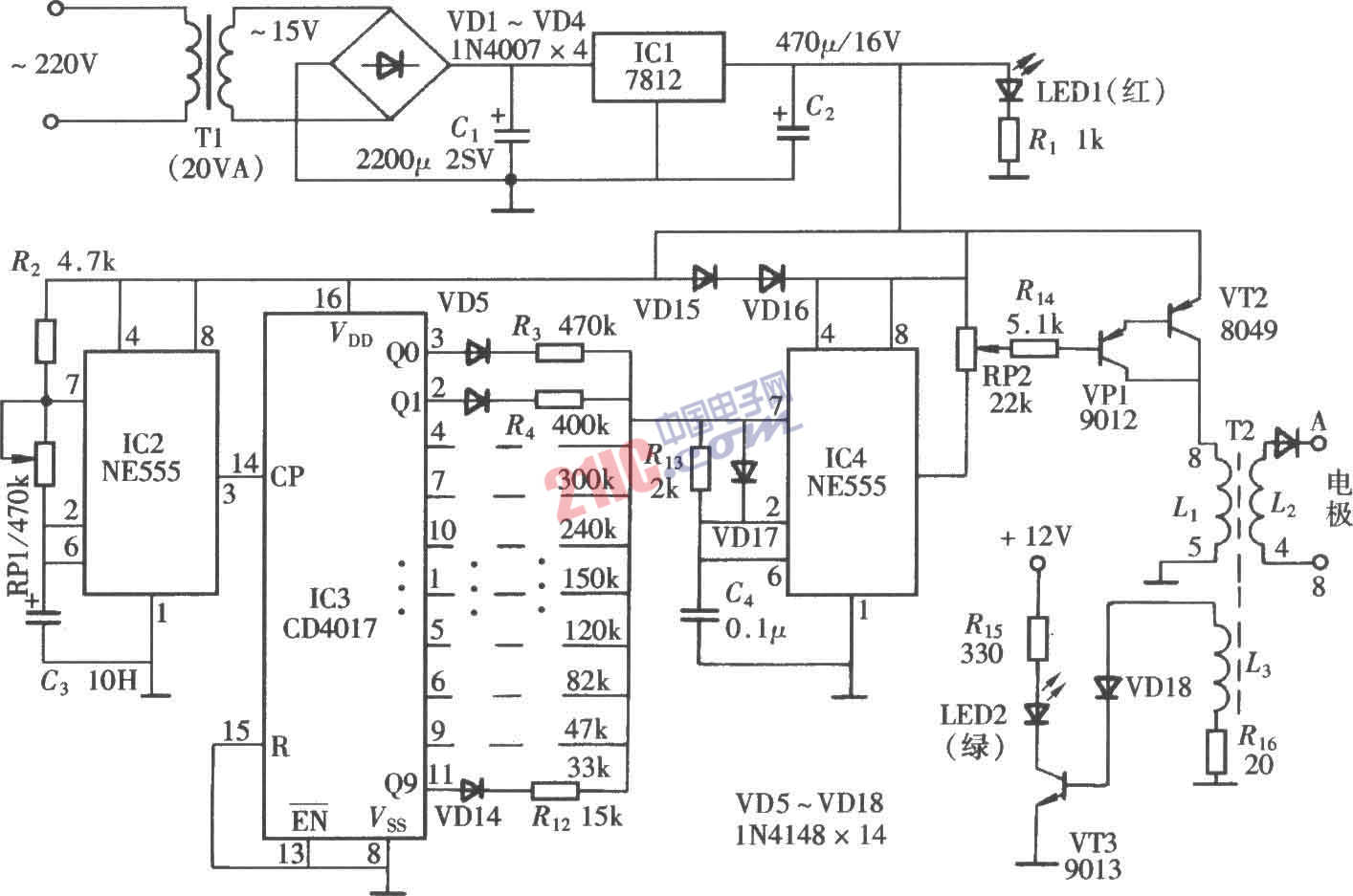 如圖所示的家用電療儀具有十擋自動循環(huán)變換輸出頻率的功能,且其輸出脈沖強度和頻率變換速度均可自由調節(jié)。它輸出脈沖寬廣的頻譜很適易于用作按摩器,以消除疲勞和作為一些常見病的輔助治療。電路由可變頻率式脈沖振蕩器、振蕩頻率變換控制器和脈沖輸出電路組成。