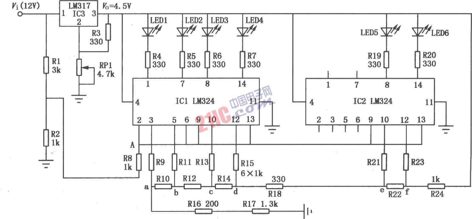 本電路主要由6只發(fā)光二極管、2只集成電路及一些電阻組成,可根據(jù)發(fā)光二極管點(diǎn)亮的多少來(lái)顯示汽車、摩托車或電動(dòng)自行車蓄電池的電壓值,使用起來(lái)十分方便。