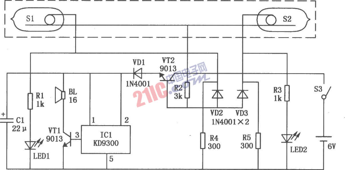 普通水平儀是靠觀察水平尺中心空氣泡是否在其中心位置,來確定被測物體平面是否達(dá)到了水平。在光線較暗的環(huán)境里,肉眼不易看清物體,就難以準(zhǔn)確判斷。電子水平儀用聲光的變化來指示物體平面是否達(dá)到水平,從而可在任何亮度的環(huán)境中進(jìn)行測量,使用十分方便。如圖所示為電子水平儀電路。