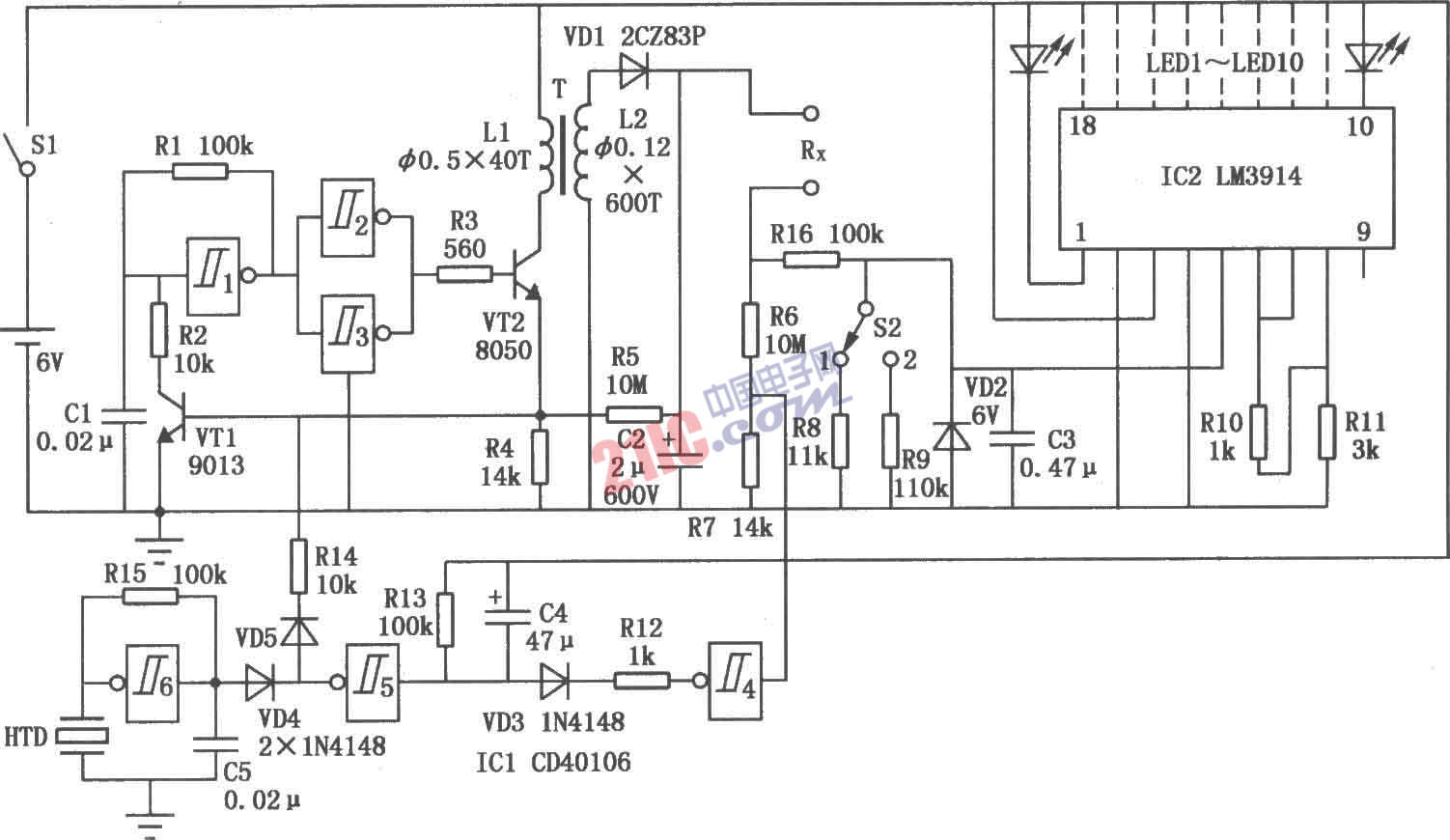 便攜式兆歐表電路如圖所示。ICl為六施密特觸發(fā)器CD40106,其中觸發(fā)器l構(gòu)成振蕩電路,觸發(fā)器2、3組成驅(qū)動電路。它們輸出的振蕩信號推動開關(guān)管VT2工作,再由變壓器T升壓、二極管VDl整流,便可得到500V的直流測試電壓。電阻R4、R5的分壓控制調(diào)整管VTl的導(dǎo)通電阻,以改變振蕩信號的脈沖寬度,使500V直流電壓在測量時保持穩(wěn)定。IC2為收錄機專用顯示集成電路LM3914,其輸出端所接發(fā)光二極管LEDl LEDl0用來顯示被測電阻Rx的大小。IC2的⑤腳輸入電壓每遞增0.5V,就使IC2的十個輸出端從⑩腳到①腳依次輸出低電平,使相應(yīng)的發(fā)光二極管發(fā)光,指示出被測電阻的阻值。轉(zhuǎn)換開關(guān)S2置于“1”時,測量范圍為l~10MΩ;S2置于“2”時,測量范圍為l0~100MΩ。ICl中的觸發(fā)器4、5、6組成絕緣電阻測試電路。當(dāng)絕緣電阻短路時,觸發(fā)器4輸出高電平,延時5秒后,觸發(fā)器5也輸出高電平,使VTl飽和導(dǎo)通,觸發(fā)器l組成的振蕩電路停振,同時觸發(fā)器6組成的振蕩電路使壓電陶瓷片HTD發(fā)出聲響。當(dāng)短路的絕緣電阻拆下時,經(jīng)過5秒鐘,電路自動恢復(fù)到正常狀態(tài)。在作絕緣電阻測試時,穩(wěn)壓二極管VD2對IC2起保護作用。