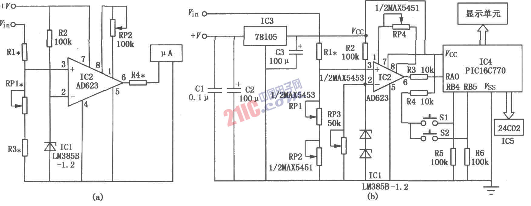 高精度區(qū)間電壓表電原理圖如圖(a)所示。電路采用了放大器和一些高精度元器件,極大地提高了區(qū)間電壓表的性能。IC2儀表放大器AD623反向輸入端用一個(gè)高精度電壓基準(zhǔn)源ICl做基準(zhǔn)。正向輸入端的Rl、RPl、R3對(duì)被測(cè)電壓分壓進(jìn)行放大。RPl為調(diào)零電位器,RP2為增益調(diào)整電位器,放大器輸出端經(jīng)過(guò)分壓電阻R4接一個(gè)標(biāo)有起始值和終止值的表頭。選定一個(gè)被測(cè)電壓Vin的區(qū)間,起始值為V1,終止值為V2,被測(cè)電壓Vin在V1~V2范圍內(nèi)變化。輸入一標(biāo)準(zhǔn)電壓為V1時(shí),調(diào)整電位器RPl,使放大器輸出端的表頭為0V,也就是區(qū)間電壓表的起始值;輸入標(biāo)準(zhǔn)電壓為V2時(shí),調(diào)整電位器RP2,使表頭滿(mǎn)刻度即區(qū)間電壓表的終止值。這樣,被測(cè)電壓在V1~V2之間變化時(shí),表頭的指針在起始值和終止值內(nèi)擺動(dòng)。