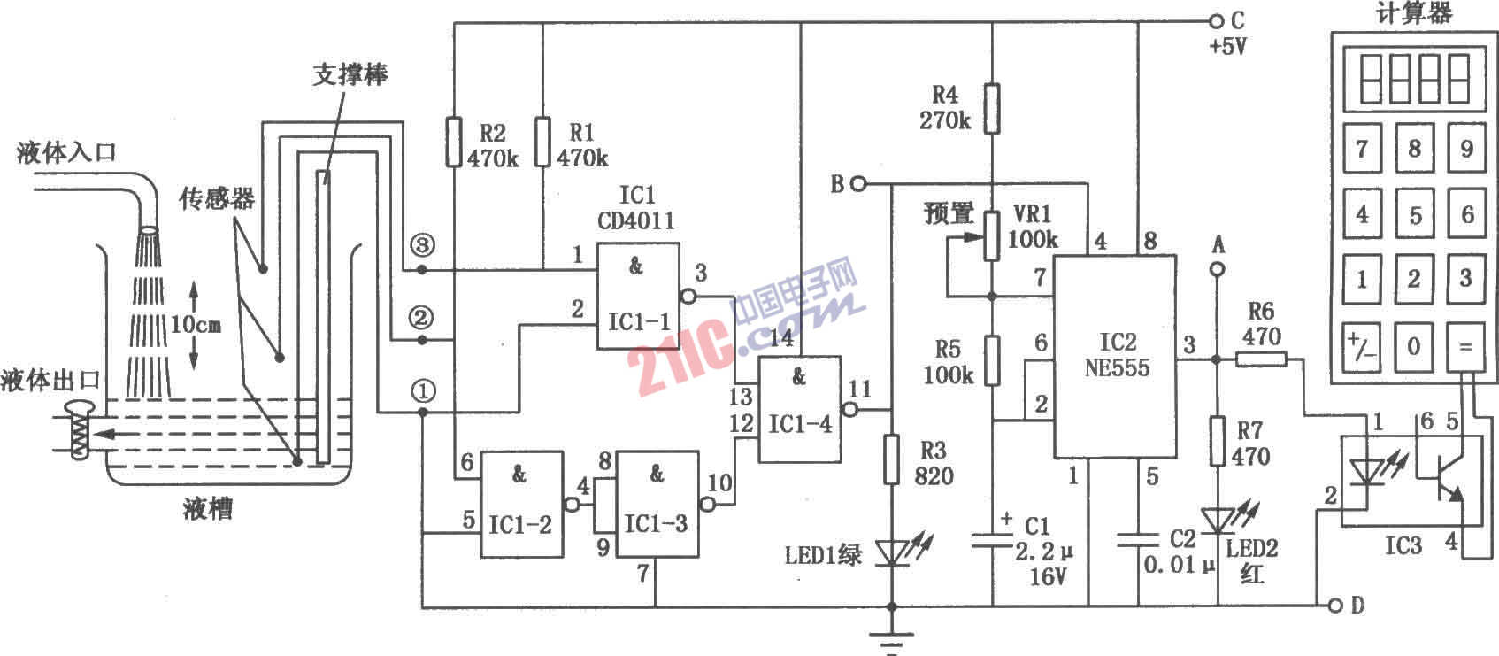 簡(jiǎn)易流量表由傳感器、邏輯控制器、脈沖發(fā)生器和開關(guān)模塊等4部分組成,其電路如圖所示。