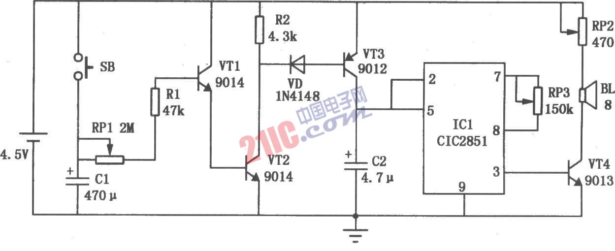 音樂催眠器由定時電路和音樂發(fā)聲電路兩部分組成,具體電路如圖所示。三極管VTl~VT3組成定時電路;ICl音樂集成電路CIC2851和三極管VT4等元件組成音樂發(fā)聲電路。按下按鈕開關(guān)SB,Cl被充電,VTl、VT2導(dǎo)通。松開SB后,由于Cl貯存電荷通過RPl和Rl向VTl基極放電,VTl、VT2仍能保持導(dǎo)通狀態(tài)。VT3基極通過二極管VD從VT2的c、e極問獲得正向偏流而導(dǎo)通,ICl得電工作,其③腳輸出音樂信號經(jīng)VT4放大后推動喇叭BL發(fā)聲。由于ICl觸發(fā)端②腳接電源正極,故在定時時間內(nèi)喇叭將周而復(fù)始地演奏貯存在ICl內(nèi)的音樂,從而達(dá)到催眠的目的。當(dāng)Cl貯存的電荷放到一定程度后,VTl、VT2就由導(dǎo)通狀態(tài)轉(zhuǎn)為截止?fàn)顟B(tài),VT3也隨之截止,ICl失電不工作,喇叭就停止發(fā)聲。電位器RPl用來調(diào)節(jié)定時時間,圖示數(shù)據(jù)可在一小時內(nèi)連續(xù)可調(diào)(若嫌定時時間還不足,可增大Cl容量來解決)。RP2用來調(diào)節(jié)喇叭的音量。樂曲演奏速度由RP3調(diào)節(jié)。