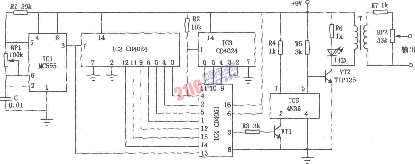 多功能理療儀電路如圖所示。它的電刺激脈沖頻率可從2~256Hz分八擋以2的倍數(shù)遞增(或遞減),每個(gè)頻擋持續(xù)8秒,自動(dòng)轉(zhuǎn)換,循環(huán)工作。