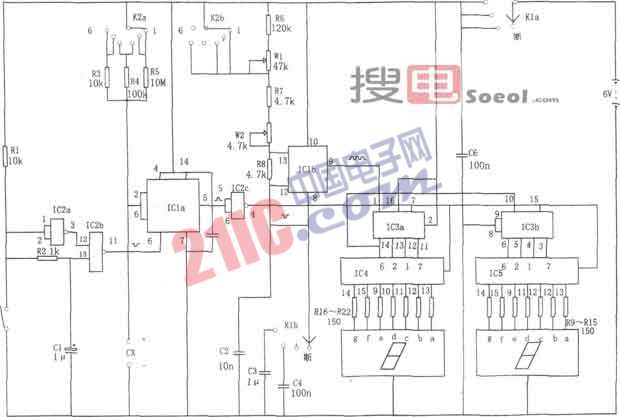 如圖所示為數(shù)字式電容測(cè)試電路。該測(cè)試儀由時(shí)基脈沖發(fā)生器、單穩(wěn)態(tài)觸發(fā)器、加法計(jì)數(shù)器、譯碼、驅(qū)動(dòng)器及LED發(fā)光數(shù)碼管等組成。時(shí)基脈沖發(fā)生器由IC1b(1/2 556)及R6、R7、R8、W1、W2、C2等組成,其輸出的脈沖信號(hào)作為計(jì)數(shù)電路(IC3)所需要的計(jì)數(shù)脈沖。單穩(wěn)態(tài)觸發(fā)器IC1a(1/2 556)與R3~R5、Cx(待測(cè)電容)等組成,其輸出的觸發(fā)脈沖的寬度為td=1.1(R3~R5)Cx,待測(cè)電容Cx越大,則觸發(fā)脈沖的定時(shí)寬度越大,相應(yīng)計(jì)數(shù)器IC3的計(jì)數(shù)就越多。通過(guò)量程選擇旋鈕,可讀出兩位顯示數(shù)字。計(jì)數(shù)電路IC3采用雙BCD加法計(jì)數(shù)器CD4518,IC4、IC采用BCD-七段鎖存、譯碼驅(qū)動(dòng)器CD4518,發(fā)光數(shù)碼管LED采用與CD4511相配的共陰極數(shù)碼管。調(diào)節(jié)電路中的電位器W1、W2可校正該測(cè)試儀,以便得到9.09kHz和0.909kHz的頻率信號(hào)。電路中將選擇開(kāi)關(guān)K2置于位置“l(fā)”,將電位器W1和電阻R6短路,調(diào)節(jié)電位器W2,使電路輸出周期為1.1ms(9.09kHz)的信號(hào);然后將選擇開(kāi)關(guān)K2置于位置“2”,調(diào)節(jié)電位器W1,使電路輸出周期為11ms(0.909kHz)的信號(hào)。本測(cè)試儀測(cè)量電容的測(cè)量范圍為:100pF~9900μF,可分為8個(gè)量程。