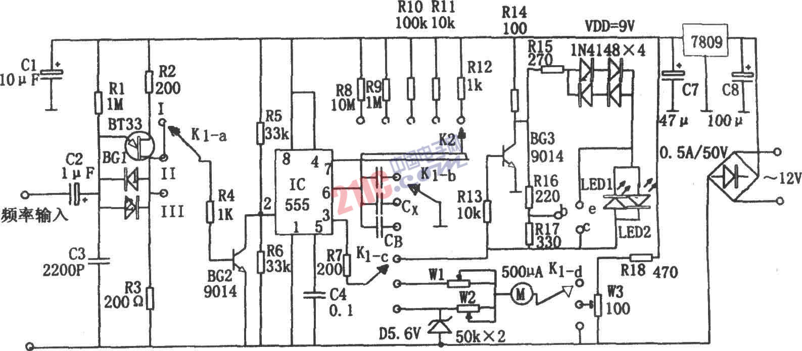 如圖所示為電容、頻率、晶體管在線檢測電路。本檢測器對電容、頻率、晶體管進(jìn)行檢測時(shí)可通過調(diào)節(jié)預(yù)置開關(guān)K1來轉(zhuǎn)換。 將K1置于II可檢測電容。555和R8~R12及待測電容Cx組成單穩(wěn)定時(shí)電路,Cx容量越大,則脈沖越寬,即td=1.1(R8~R12)Cx越長,電流平均值越大,相應(yīng)表頭的指示越大。電路中BG1為單結(jié)晶體管,其與R1、C3組成弛張振蕩器,其輸出的振蕩脈沖信號作為IC的觸發(fā)脈沖。將K1置于III可進(jìn)行頻率測量。此時(shí)單穩(wěn)電路IC輸出td'=1.1(R8~R12)CB的定值寬度的信號。輸入信號的頻率越高。IC被觸發(fā)的次數(shù)越多,則電流平均值越大,相應(yīng)表頭指示也越大。將K1置于I可進(jìn)行在線晶體管測試。該原理類似于檢測電容。電路中晶體管BG1完成正負(fù)電源的轉(zhuǎn)換。隨著IC輸出高、低電平的交替變化,若發(fā)光二極管LED1、LED2依次發(fā)光,則說明晶體管是好的,否則晶體管是壞的。