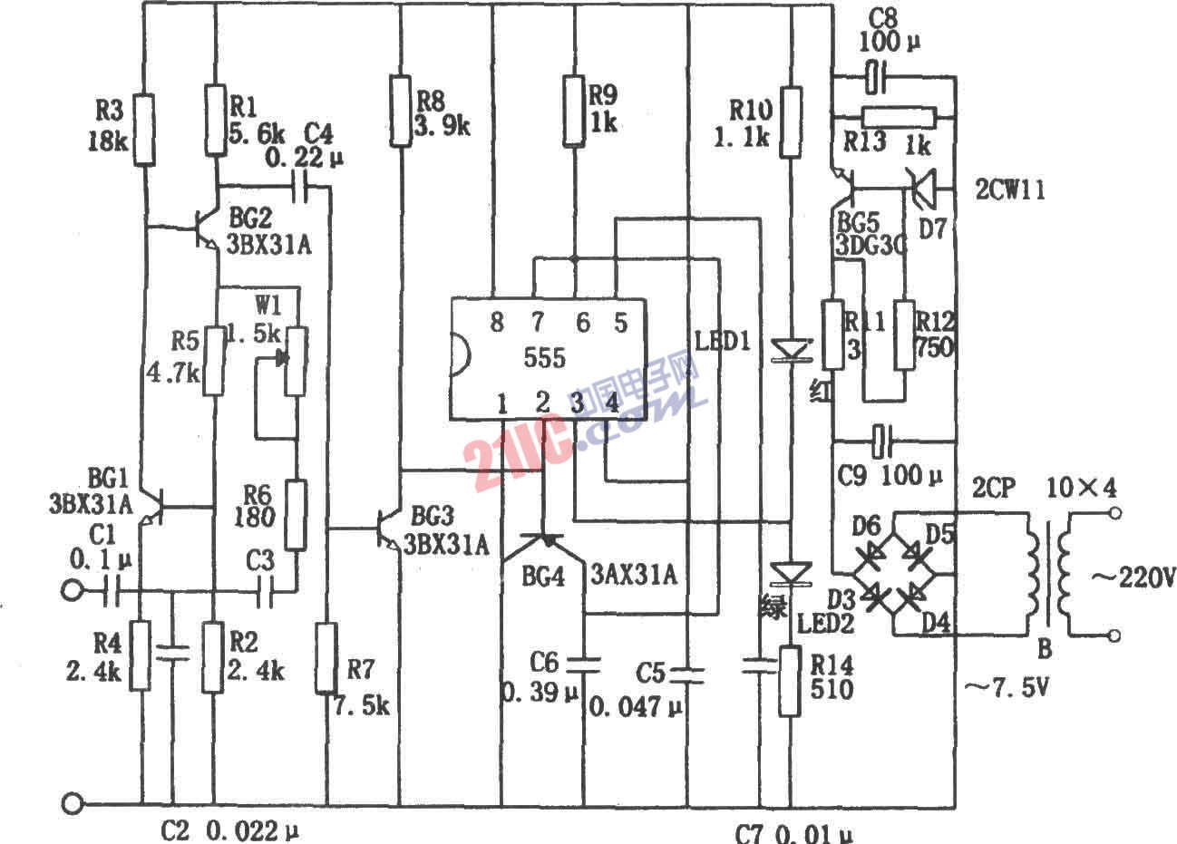 如圖所示為行輸出變壓器短路檢測電路。該檢測器由降壓整流電路、文氏電橋振蕩器、失落脈沖檢測器、指示電路等組成。其中降壓整流電路為整個(gè)電路提供直流電壓。文氏電橋振蕩器由BG1、BG2、W1、R1、R6、C2、C3等組成,其振蕩信號的頻率約為f1=5kHz。若待測行輸出變壓器接在C1輸入端,則該振蕩器變成電容三點(diǎn)式振蕩器。同時(shí)因電感L和電容C1的介入,其振蕩頻率變?yōu)閒2=10kHz~30kHz。失落脈沖檢測器由555和BG4、C6、R9等組成。當(dāng)變壓器正常時(shí),由555和R9、C6組成的單穩(wěn)定時(shí)電路的定時(shí)周期大于輸入觸發(fā)脈沖的周期,故在連續(xù)觸發(fā)下,555 3腳持續(xù)呈高電平(約+5V),發(fā)光二極管LED2(綠色)點(diǎn)亮,以說明行輸出變壓器無短路或擊穿現(xiàn)象。若變壓器短路或擊穿,則因變壓器繞組間的互感作用,變壓器呈低阻抗、高阻尼,振蕩器停振,相應(yīng)555因②腳得不到觸發(fā)信號而由③腳輸出低電平,使發(fā)光二極管LED1(紅色)點(diǎn)亮,以指示變壓器不正常。采用本電路后,可通過LED1或LED2的亮與滅來判斷變壓器是否擊穿或短路,不僅顯示直觀,且易判斷準(zhǔn)確,同時(shí)還可判斷行輸出變壓器的在線或拆下情況。