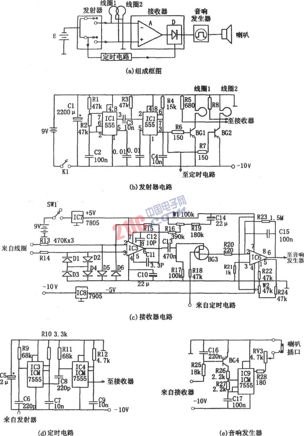 如下圖所示為雙線圈金屬探測器電路。該探測器由探測頭、發(fā)射器、接收器、定時器和音響發(fā)射器等組成。發(fā)射電路如圖(b)所示,由多諧振蕩器(IC1、R1、R2、C2)、單穩(wěn)定時器(IC2、R4、C4)組成,且定時器IC2受多諧振蕩器IC1輸出的脈沖觸發(fā)。振蕩器的振蕩頻率為f=1.44/(R1+2R2)C2,圖示參數(shù)對應的約為100Hz。定時器的定時時間為td =l.1R4C4,圖示參數(shù)對應的約為165μs。在定時時間內(nèi),由IC2③腳輸出的(高電平)信號使BG1、BG2飽和導通。接收電路如圖(c)所示,主要由差分放大器和檢測放大器組成。差分藏大器IC5(μA709CP)將圖(b)中線圈的感應信號進行差分放大,放大后的信號在定時電路的開啟波門期間通過BG3,送至檢測放大器IC6。定時電路如圖(d)所示,由IC3、R10、C7和IC4、R12、C9組成的兩個單穩(wěn)延時電路組成,且IC4受IC3的輸出控制。其中前者的延遲時間為td=l.1R12C9,圖示參數(shù)對應的約為36μs;后者盼延遲時間為td2=1.1R10C7,圖示參數(shù)對應的約為50μs,其輸出信號送至接收器的BG3,以作為開啟波門。音響發(fā)生器如圖(e)所示,核心是由555(IC9)、BG4、R26、R27、C17等組成的多諧振蕩器。當無金屬感應信號時,由IC6⑥腳輸出的信號使BG4截止,多諧振蕩器不工作,相應喇叭不發(fā)聲。當有金屬感應信號,且搜索線圈逐漸向金屬體靠近時,感應信號變大,則BG4的導通狀況變好,從而使IC9的振蕩頻率逐漸增高,當接近金屬體時,由IC9輸出的高頻振蕩信號便驅動喇叭發(fā)出高頻音響,表示此處有金屬物體。