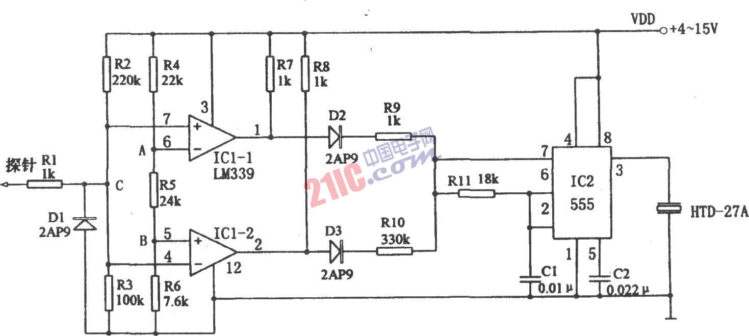 如圖所示為音響邏輯電平探頭電路。該探頭由電壓比較器、多諧振蕩器、壓電陶瓷片HTD等組成。其中后兩者組成音響電路,以音響頻率的高低來(lái)判別TTL或CMOS器件電平的高低。電壓比較器LM339(IC1)中的IC1-1、IC1-2各為1/4 LM339。分壓網(wǎng)絡(luò)R2、R3在VDD=6V時(shí)使分壓點(diǎn)C的電壓為Vc≈1.9V,其低于IC1-1的基準(zhǔn)電壓,但又高于IC1-1的基準(zhǔn)電壓,故平時(shí)二極管D2、D3均截止,振蕩器IC2不工作。當(dāng)探針接觸高、低電平或脈沖時(shí),則IC1用于檢測(cè)高電平,IC2用于檢測(cè)低電平,輸出信號(hào)相應(yīng)驅(qū)使D2、D3導(dǎo)通,并通過(guò)R9、R10、R11對(duì)C1進(jìn)行充電,使IC2起振,推動(dòng)HTD發(fā)聲。當(dāng)探針接觸高電平時(shí),IC1-1輸出信號(hào)使D2導(dǎo)通,并通過(guò)R9、R11對(duì)C1進(jìn)行充電.振蕩器起振,相應(yīng)的振蕩頻率為fH=1.44/(R10+2R11)C1,圖示參數(shù)對(duì)應(yīng)的頻率約為4kHz。當(dāng)探針接觸低電平時(shí),則相應(yīng)D3導(dǎo)通,C1通過(guò)R10、R11進(jìn)行充電,相應(yīng)振蕩電路起振后的振蕩頻率為fL=1.44/(R10+2R11)C1,圖示參數(shù)對(duì)應(yīng)的頻率約為700Hz。當(dāng)探測(cè)的是脈沖串時(shí),相應(yīng)HTD發(fā)出二者的混合聲響或發(fā)出有顫音的聲響。本電路音響頻率高判斷為高電平;音響頻率低判斷為低電平;發(fā)顫音則表示探測(cè)的是一串脈沖,從而實(shí)現(xiàn)了對(duì)邏輯電平的探測(cè)。