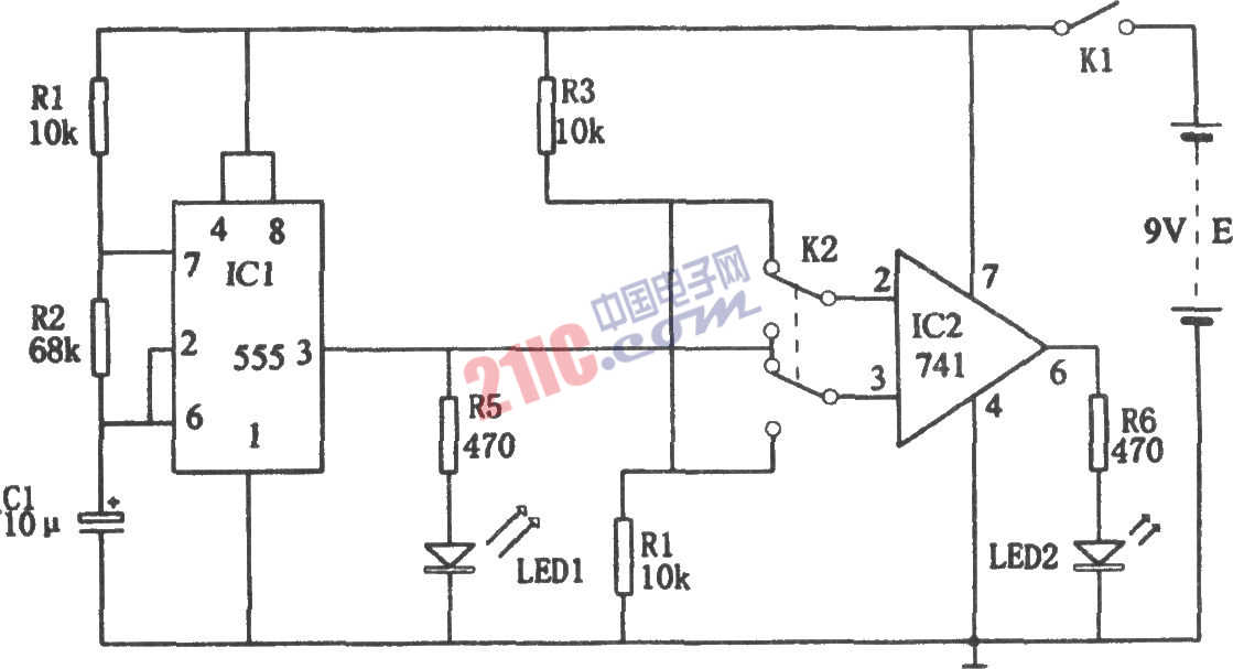 如圖所示為555和741運放好壞鑒別器電路。由555(IC1)和R1、R2、C1等組成的多諧振蕩器的振蕩頻率為f=1.44/(R1+2R2)C1,圖示參數(shù)對應(yīng)的振蕩頻率約為1Hz。若IC1(555)是好的,則其③腳輸出的信號將驅(qū)動發(fā)光二極管LED1周期地閃亮,否則,555是壞的。轉(zhuǎn)換開關(guān)K2用于控制555的輸出信號加至741(IC2)的同榴端或反相端。若555的輸出信號加至IC2的同相端,則IC2相應(yīng)輸出信號也驅(qū)使LED2發(fā)出與LED1同步的閃光。若555的輸出信號加至IC2的反相端,則IC。的輸出信號驅(qū)使LED2發(fā)出與LED1交替的閃光。若LED1亮,LED2也亮,則說明741正常,若LED1亮,LED2不亮,則說明741是壞的。