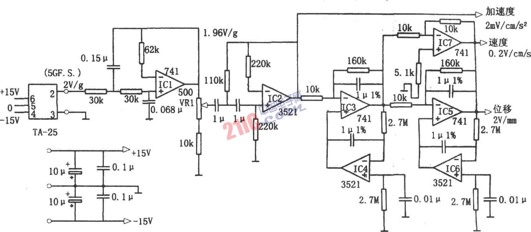 如圖所示為振動(dòng)測(cè)試電路。該測(cè)試電路由加速度計(jì)TA-25、集成運(yùn)算放大器741(IC1、IC3、IC5、IC7)、場(chǎng)效應(yīng)管輸入的低漂移運(yùn)算放大器等組成。其應(yīng)用于周期性加速檢測(cè)。由加速計(jì)TA-25輸出的信號(hào)經(jīng)過集成電路IC1(741)的低通和IC2(3521)的高通濾波后,以周期性加速度輸出。該輸出信號(hào)經(jīng)交流積分器(IC3和IC4)積分、放大器IC7放大后變換為速度信號(hào),再經(jīng)交流積分器(IC5和IC6)積分后獲得位移。本電路用于檢測(cè)加速度計(jì)輸入軸方向的周期振動(dòng),若有前后、左右和上下方向3組,則可檢測(cè)3軸方向的振動(dòng),但檢測(cè)上下方向振動(dòng)時(shí),僅有重力加速度1g左右,最大動(dòng)態(tài)范圍變窄。本電路測(cè)試的振動(dòng)頻率為1~50Hz,最大動(dòng)態(tài)范圍為±5g(使用全量程的加速度計(jì)),速度為50cm/s,位移為5cm。