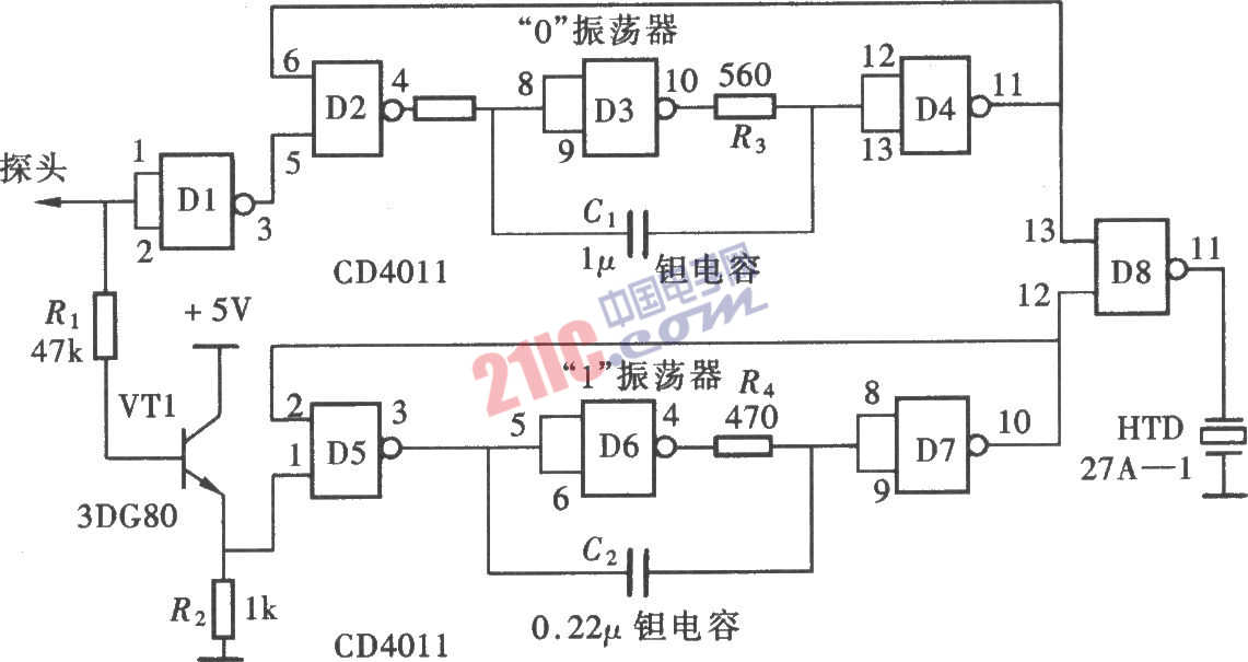 發(fā)光型邏輯筆的測試結(jié)果需要用眼來觀察。由于現(xiàn)代電子制作技術(shù)的高度發(fā)展,所制作的電路板上布置的焊點(diǎn)十分密集。所以測試時必須全神貫注,目光時刻不能離開測點(diǎn)。因此制作一個能夠發(fā)聲的測試器,使我們的耳朵也能在測試中配上用場,將會大大提高測試效率。如圖所示為采用與非門CD4011制成的發(fā)聲型邏輯筆。