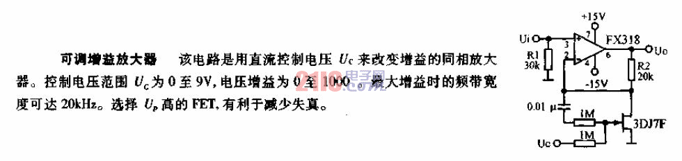該電路是用于一個電壓式轉換器的高輸入阻抗交流放大器。輸入電阻是880M,可得到的增益是10。