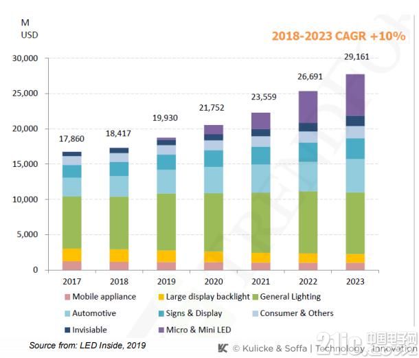 2018年因?yàn)長ED產(chǎn)品價(jià)格呈現(xiàn)下跌趨勢以及終端市場需求與預(yù)期不符的原因,LED市場價(jià)值達(dá)到180億美元,同比僅增長3%。2019年預(yù)計(jì)達(dá)到200億美元。從長遠(yuǎn)來看,LED的市場價(jià)值到2023年能達(dá)到290億美元。WW LED市場價(jià)值年復(fù)合增長率在10%左右。