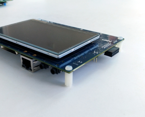LPCXpresso54608主角榮耀登場。最搶眼的還是碩大的LCD顯示屏,看上去挺不錯,非得要挑刺的話,一是屏幕似乎貼歪了,屏幕的分辨率也只有480X272,另外沒有附送支撐用的支撐柱,板子放不穩(wěn)啊,圖中板子四角的白色六角支撐柱是從STM32F769DISCO上取下來的,先用一用再說。