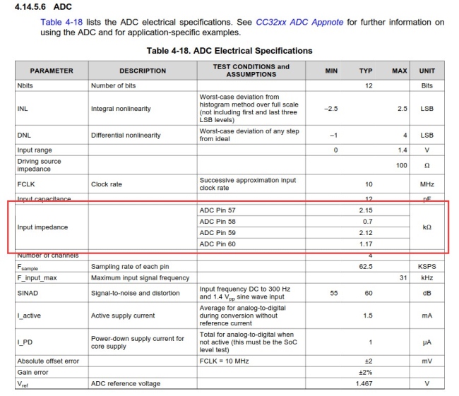 根據(jù)TI CC3220的數(shù)據(jù)手冊,可以看到四個通道的ADC的輸入阻抗還是不一樣的,并且阻抗也很小。