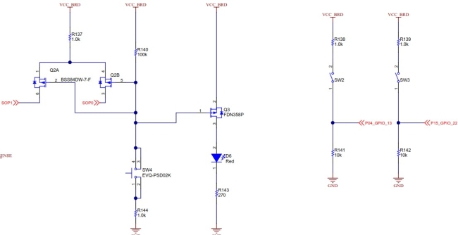 板載三個按鍵,SW4是用來恢復(fù)出廠鏡像的,SW4按下,Q2A,Q2B兩個PMOS管導(dǎo)通,即為SOP設(shè)置為011(SOP2 = 0,SOP1 = 1,SOP0 = 1);還有兩個用戶按鍵。