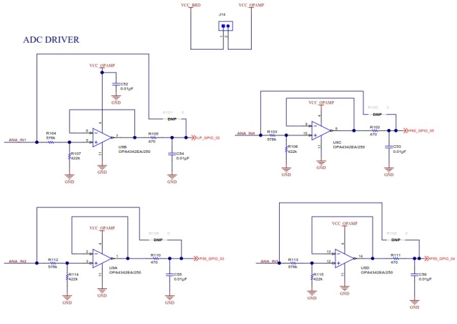 CC3220SF LAUNCHXL板子上用了一塊四通道的運(yùn)算放大器OPA434EA搭成電壓跟隨器,解決了輸入阻抗不匹配的問題。