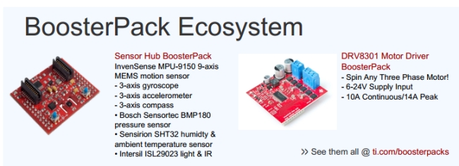 如下是TI官方提供的兩個(gè)擴(kuò)展功能板,分別側(cè)重傳感器交互功能、與電機(jī)控制方向,可以為用戶的開(kāi)發(fā)設(shè)計(jì)提供極大的便利。