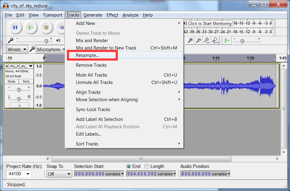 下一步要進(jìn)行重采樣到低一點(diǎn), 這一步可選, 因?yàn)锳rduio Uno的主控較弱,要播放的采樣率太高了會(huì)失真,如果你轉(zhuǎn)換的原文件如果高于44.1KHz則建議重采樣為至多44.1KHz.