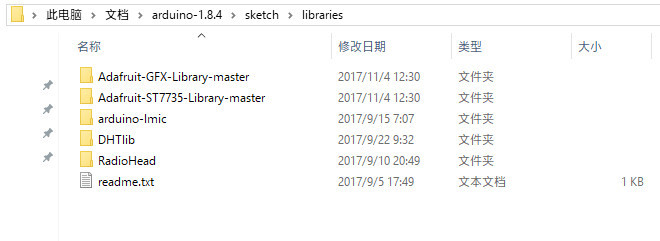 要在Arduino上使用這個(gè)擴(kuò)展板,先要安裝兩個(gè)支持庫,一個(gè)是GFX庫,另一個(gè)是ST7735庫。這兩個(gè)庫都在Adafruit的官方github上。下載好兩個(gè)庫的zip包文件后,添加到Arduino的本地庫中,目錄結(jié)構(gòu)如下