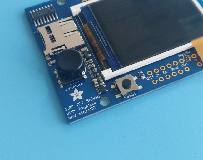 擴(kuò)展板特寫圖,可以清楚看到Adafruit的LOGO及SD接口及游戲搖桿。
