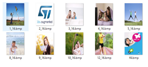 實(shí)際測試過程中發(fā)現(xiàn),圖像顯示的速度比較慢,如果從SD卡讀取并顯示圖像的時(shí)候,這個(gè)過程就更慢了。另外在讀取SD卡的過程中,偶爾會(huì)發(fā)現(xiàn)不能正確識(shí)別SD卡,需要按一下開發(fā)板上的復(fù)位后才能正確識(shí)別。還有一個(gè)問題,部分BMP格式文件不能正確識(shí)別,使用ST HAL庫中的BMP文件,都不能正確識(shí)別,下面是ST HAL庫中提供的一些測試樣本,
