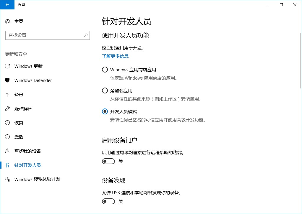 開發(fā)者模式為開發(fā)者安裝、測試Windows Universal Application提供了支持,如果你是一名Windows應用商店程序開發(fā)者,這個模式應該已啟用了。