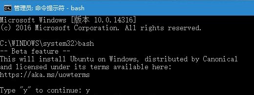 準備工作完成得差不多了,接下來準備將Linux系統(tǒng)安裝到Windows上。打開命令提示符,在提示符下輸入命令bash,會提示用戶按y鍵繼續(xù)