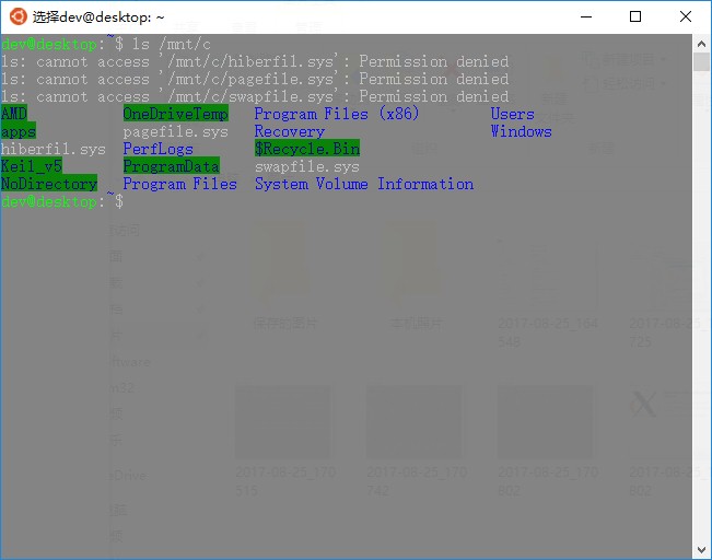 在WSL中,整個C盤(筆者的機(jī)器就只有一個C盤)被映射到/mnt/c目錄下,通過該掛載點(diǎn)就可以訪問整個硬盤上的文件了,如下