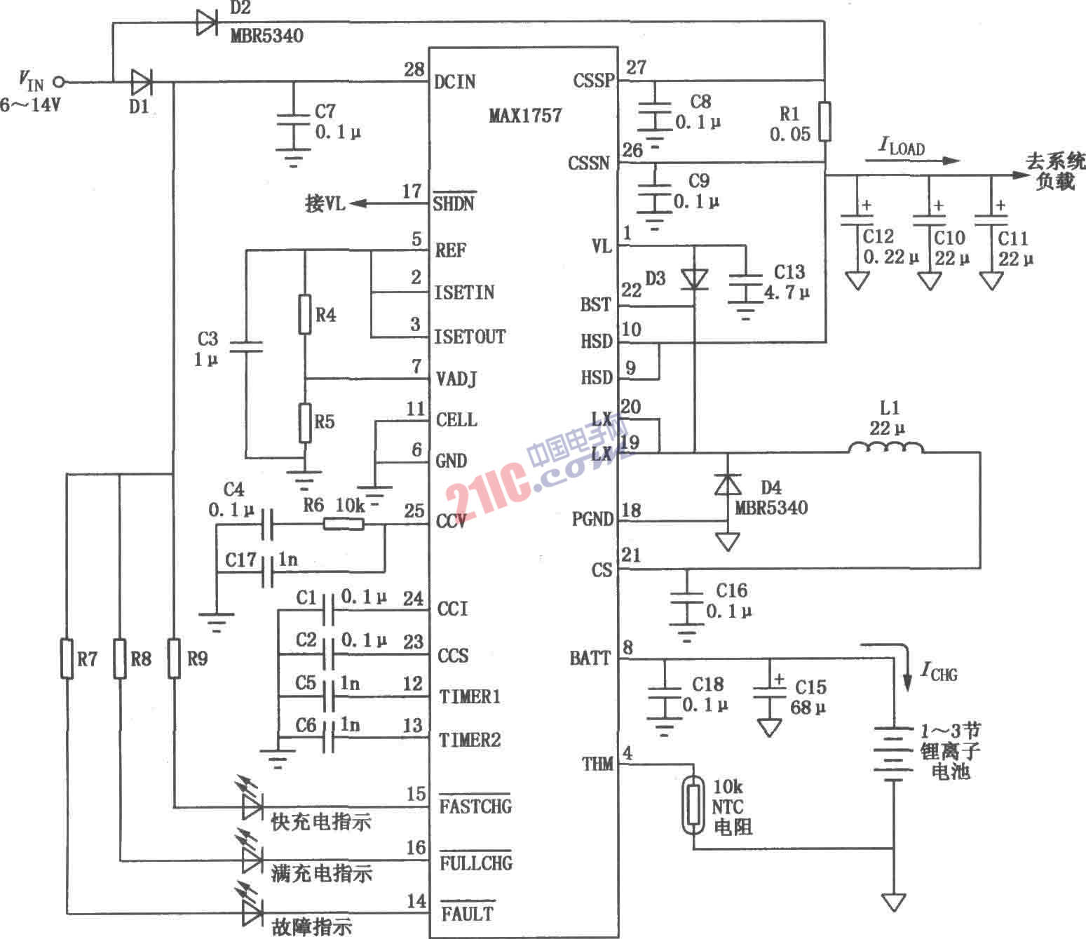 MAX1757由電源及充電器兩部分組成。電源部分有降壓式DC/DC變換器及5.4V線性穩(wěn)壓器。DC/ DC變換器可恒流及恒壓向電池充電,最大充電電流可達(dá)1.5A。MAX1757的典型應(yīng)用電路如圖所示。