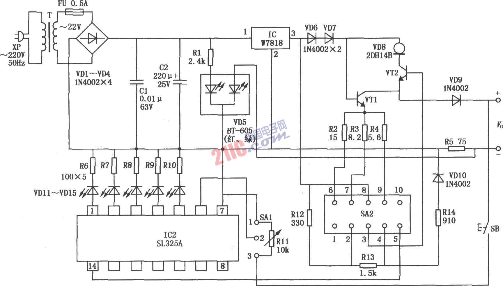本電路為多功能鎳鎘電池充電器,可用于便攜式無(wú)線電通訊機(jī)專用鎳鎘電池的充電,同時(shí)還可以對(duì)標(biāo)準(zhǔn)5號(hào)鎳鎘電池2節(jié)或4節(jié)進(jìn)行充電。充電時(shí),當(dāng)充電電池容量達(dá)到飽和狀態(tài),它能自動(dòng)終止充電,防止電池的“過(guò)充”,并具有電池容量檢測(cè)顯示。