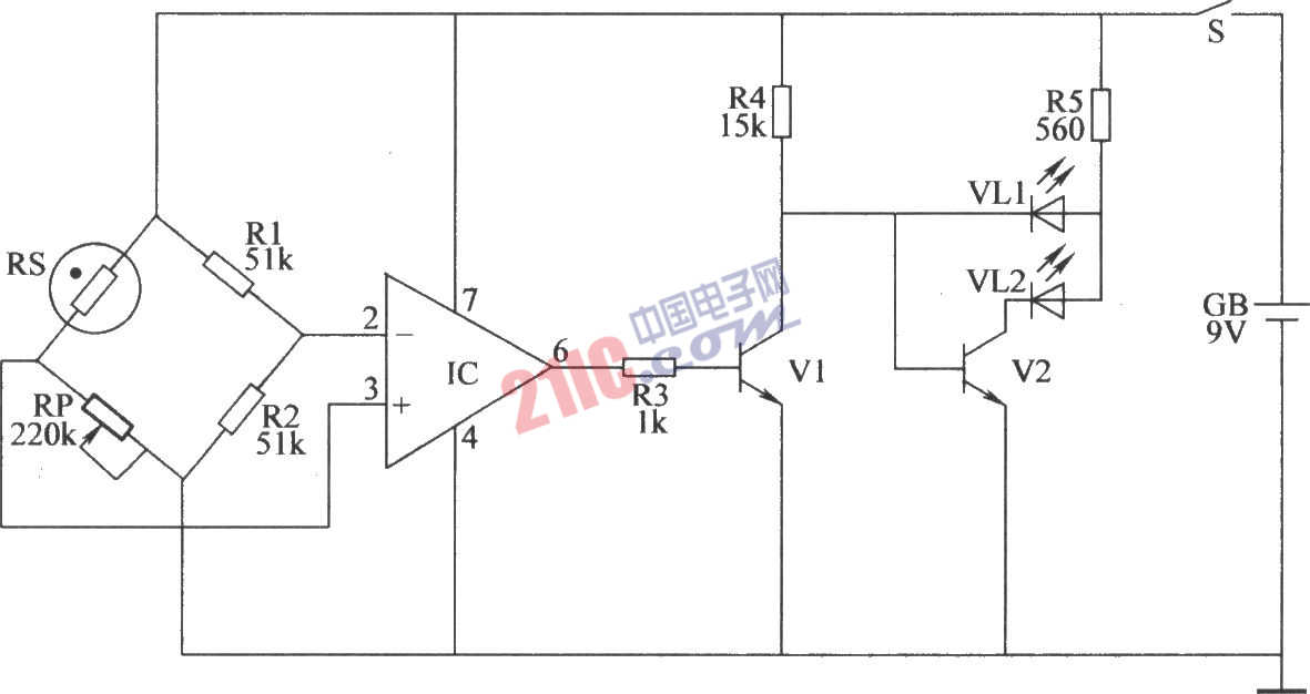 調(diào)節(jié)RP的阻值,可以設(shè)定需要警示的濕度值。元器件選擇 R1~R5選用1/4W金屬膜電阻器或碳膜電阻器。 RP選用有機(jī)實(shí)心電位器或可變電阻器。 RS用值大于100的3DG6型晶體管制作:去掉該晶體管的金屬帽后,將其放在濃鹽水中 浸泡后曬干,實(shí)測(cè)干時(shí)其c、e極問電阻值大于200kΩ,濕時(shí)其C、e極間電阻值為10kΩ左右卸可。測(cè)量時(shí),用萬用表的黑表筆接c極,紅表筆接額極,用嘴向晶體管心片上呵氣時(shí),萬用表指針應(yīng)迅速向右擺動(dòng);當(dāng)管心片上的水蒸氣蒸發(fā)后,表針能漸漸向左擺回即為正常。 VL1和VL2均選用φ5mm的發(fā)光二極管。 V1和V2均選用3DG6或S9013型硅NPN晶體管。 IC選用µA741或5G24型運(yùn)算放大器集成電路。 GB選用9V疊層電池。 S選用小型單極撥動(dòng)式開關(guān)。