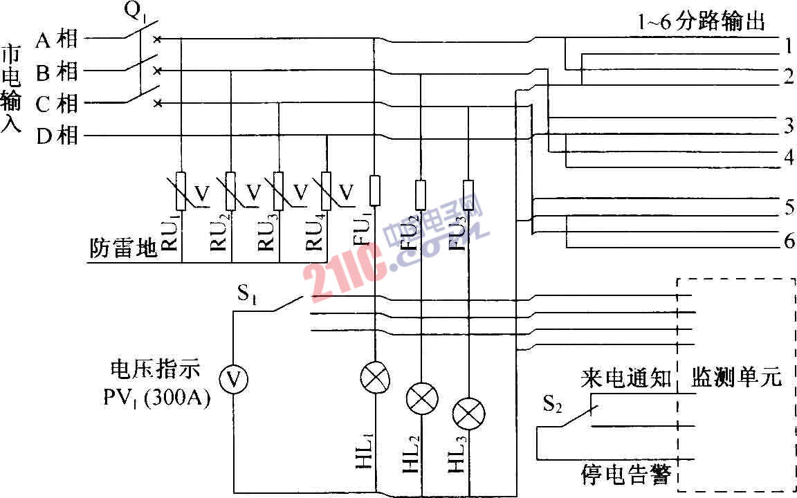 DUT07高頻開(kāi)關(guān)電源系統(tǒng)是以DZW75-48/50(50II)型整流器模塊為基礎(chǔ),配以JP50-50II)型交流配電箱。如圖所示為P50-交流配電箱原理圖。