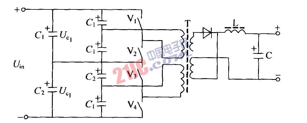 對于高壓輸入,大功率輸出的情況下,一般采用如圖所示的電路方式。在電路中,開關(guān)器件V1、V2為一組,V3、V4為一組,雙雙串聯(lián),可減少單管耐壓值。在實際應(yīng)用電路中開關(guān)器件V1、V2、V3、V4可采用雙管或多管并聯(lián),可解決大電流輸出問題。共用變壓器可提高變壓器利用率,并具有抗不平衡能力。在變形的串聯(lián)型半橋式功率變換電路中,V1、V2或V3、V4每只開關(guān)管的最大耐壓值僅為Uc1或Uc2值,如果C1=C2,則Uc1=Uc2=Uin/2值,因此可以選擇降低耐壓的開關(guān)管。另外V1、V2、V3、V4可以采用多管并聯(lián)方式工作,增大輸出電流的容量;對于變壓器T可以工作在正反方向,大大地提高了變壓器效率。鑒于上述優(yōu)點,該電路得到了較廣泛的應(yīng)用,特別是在高電壓輸入和大功率輸出的場合,其應(yīng)用越來越普遍。
