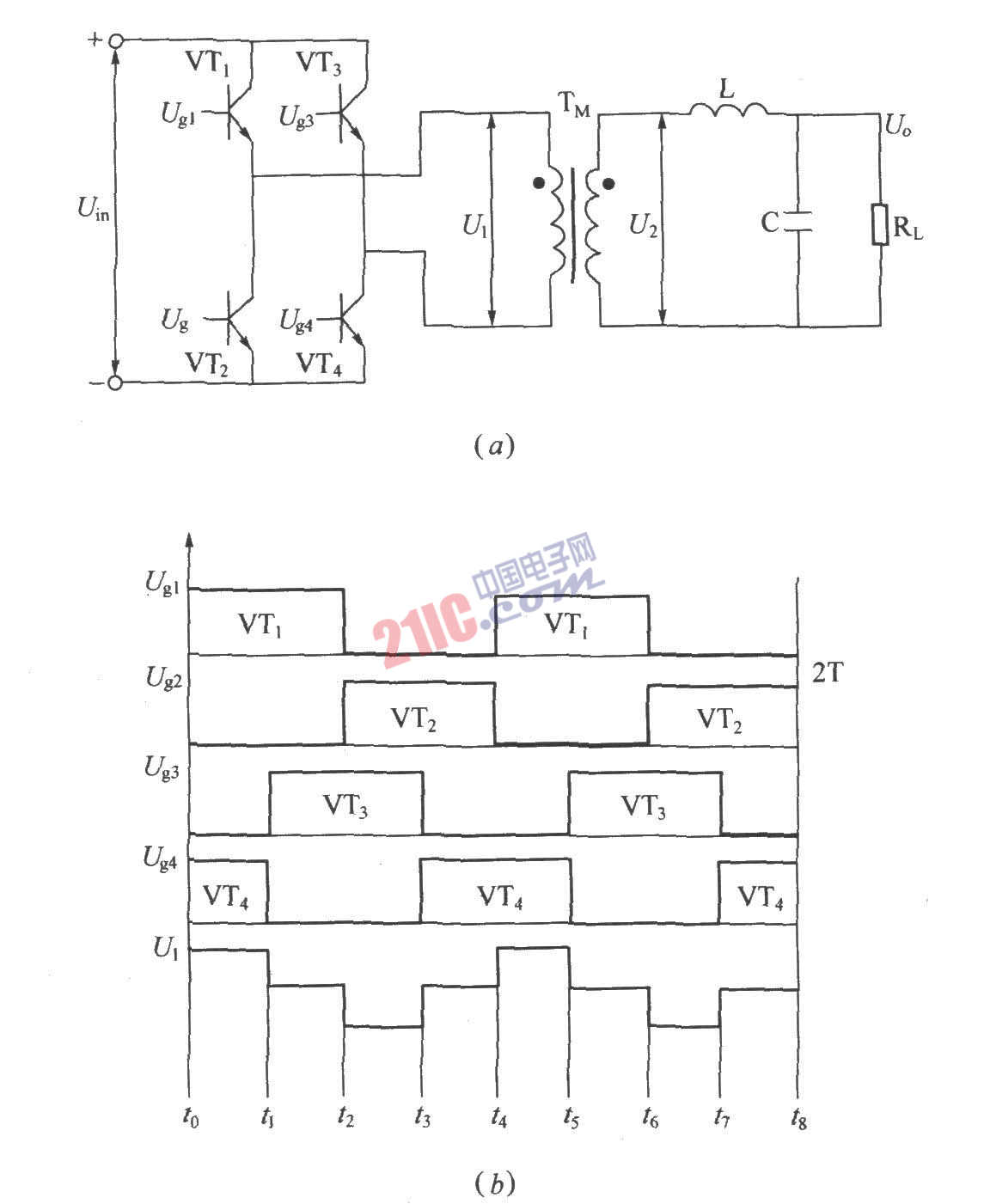 單相逆變器電路有推挽式、半橋式和全橋式,其中,以全橋式逆變電路應(yīng)用最為普遍。單相全橋式逆變電路原理如圖(a)所示。(b)圖為激勵(lì)信號(hào)和輸出電壓波形。