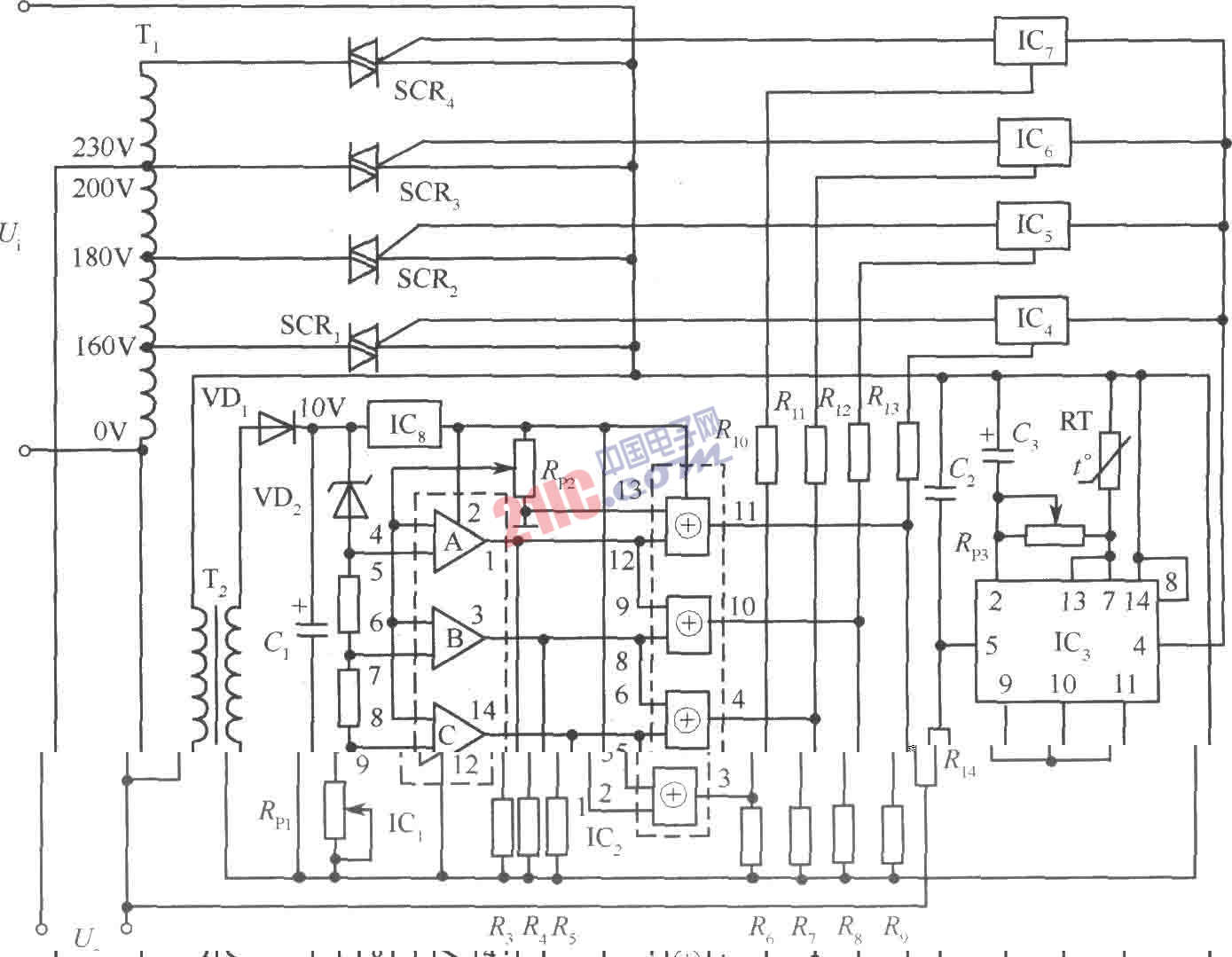 圖中,T1:自耦變壓器;Y2:取樣變壓器;ICl:LM339;IC2:CD4070;IC3:TWH9205; IC4~I(xiàn)C7:TWH8778;IC8:W7806;電阻Rl、R2:150Ω;R3~R9:10kΩ;Rl0~Rl3:20kΩ;R14:20kΩ、4W;熱敏電阻RT:47kΩ;RPl:680Ω;Rp2:4.7kΩ;Rp3:100kΩ;Cl:47μFl6V;C2:0.1μF;C3:100μF16V;VD1:lN4002;VD2:2CW54;可控硅SCRl~SCR4可據(jù)負(fù)載功率的大小來合理選擇。