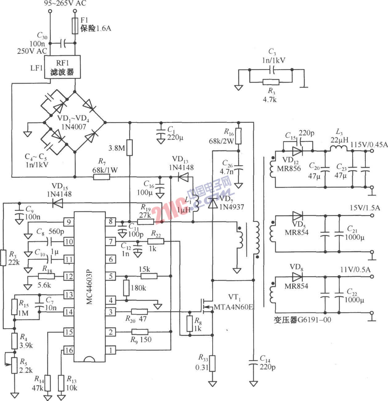 由MC44603P構(gòu)成的三輸出電源電路