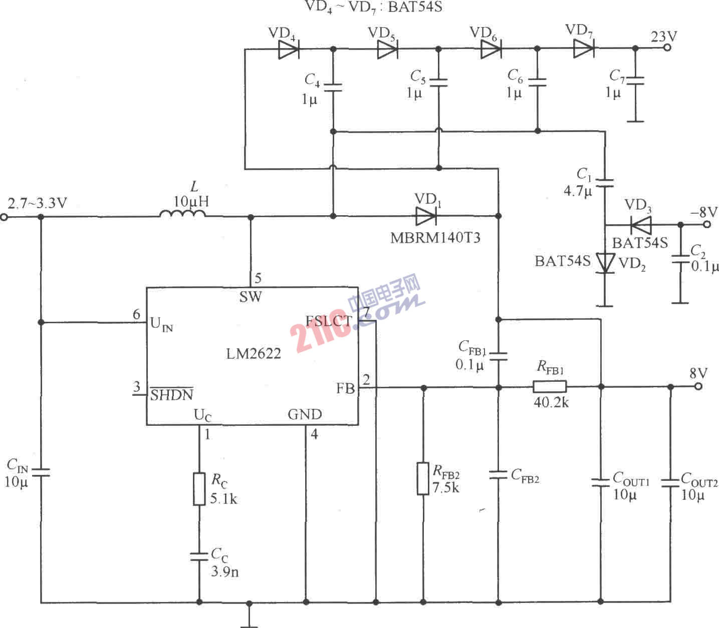 由LM2622構(gòu)成的三輸出電壓為23V、8V、-8V的電源電路如圖所示。LM2622是一個600kHz升壓PWM DC/DC變換器,它可將3.3V輸入電壓轉(zhuǎn)換為8V、-8V和23V三輸出電壓,輸出電流可達l.6A??梢允褂脼V波器和低噪聲元件,工作電壓可以低至2.0V。